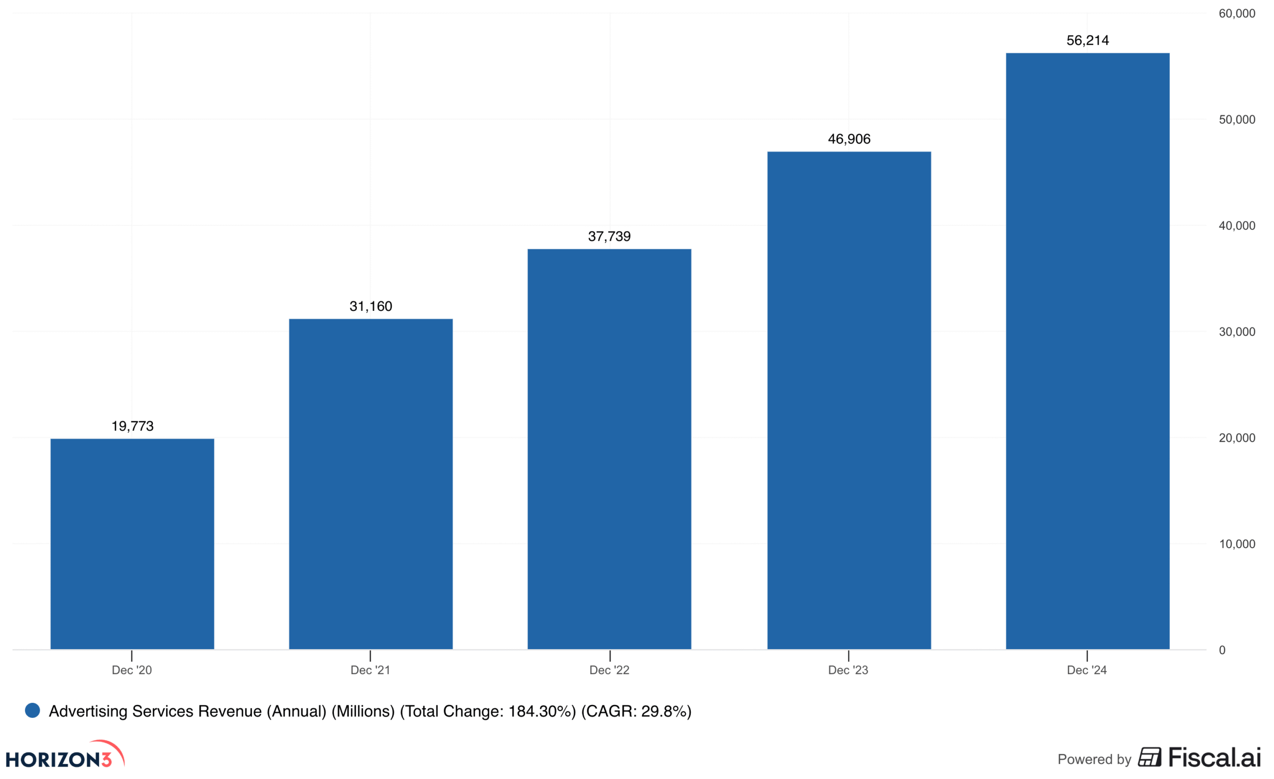 Amazon repræsenterer det store, integrerede økosystem, hvor e-commerce, cloud og annoncering smelter sammen. Deres annonceforretning er fra 2020 til 2024 vokset næsten 30% om året til en omsætning sidste år på mere end $56 mia.