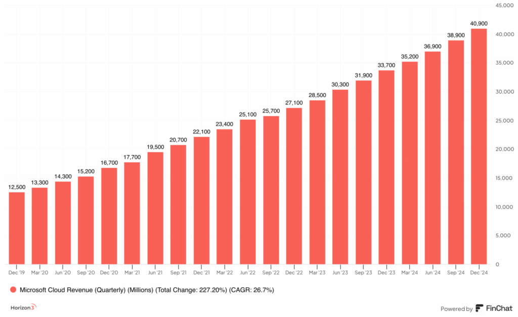 Set med fondens øjne er cloudforretningen den vigtigste del af vores investeringscase for Microsoft. I figur 2 herunder har vi vist, at den del af forretningen de sidste fem år er vokset med i gennemsnit næsten 27% årligt til $151,9 mia., hvis man lægger tallene fra de sidte fire kvartaler sammen.