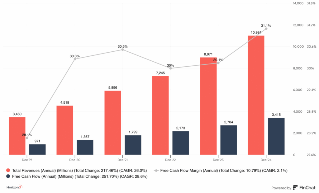 Omsætningsvæksten for 2024 var 22,5% i forhold til 2023. Store investeringer i vækst og innovation til trods formåede ServiceNow at konvertere 31,1% af årets omsætning til frit cash flow. Dermed opnår de en rule-of-40 score på 54, når væksten lægges til den frie cash flow margin.