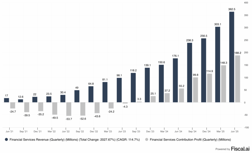 En stor del af væksten inden for segmentet finansielle services kommer fra deres Loan Platform Business. Her låner SoFi ikke egne penge ud, men stiller deres teknologi og distributionskanaler til rådighed for andre banker og långivere, som ønsker at udstede lån. I takt med at det sker, får SoFi en del af indtægten.